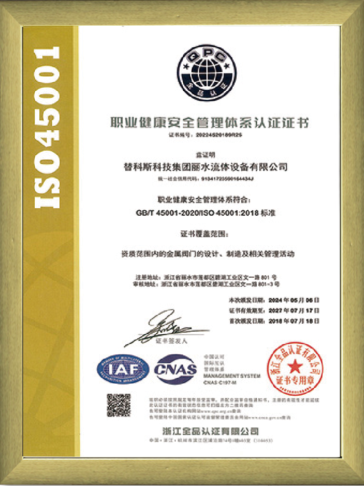 ISO45001職業健康安全管理體系認證證書